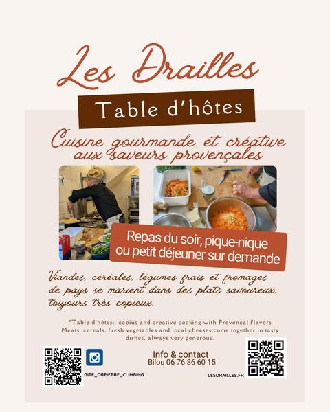 Dans le cadre de notre activité de table d'hôtes, nous proposons aussi un service de repas à la demande pour les touristes de passage ou toute personne souhaitant découvrir une cuisine locale et généreuse. Repas à empoter ou à déguster sur place.