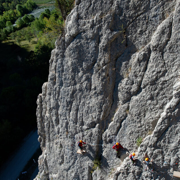 - Transmettre les informations : comment s’équiper, comment progresser en via ferrata, assurer le briefing pour les tyroliennes, descriptif des parcours, éléments de sécurité, vérification des équipements individuels, aide à l’équipe.